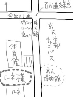 ルネ横は京大西部構内、体育館の南、食堂・購買ルネの北、本部博物館の真向かいの空間です。